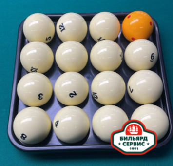 Качественный аналог шаров Aramith. Вес шара выдержан в границах 256-257 г. Диаметр 67 мм, желтый биток с красными точками.