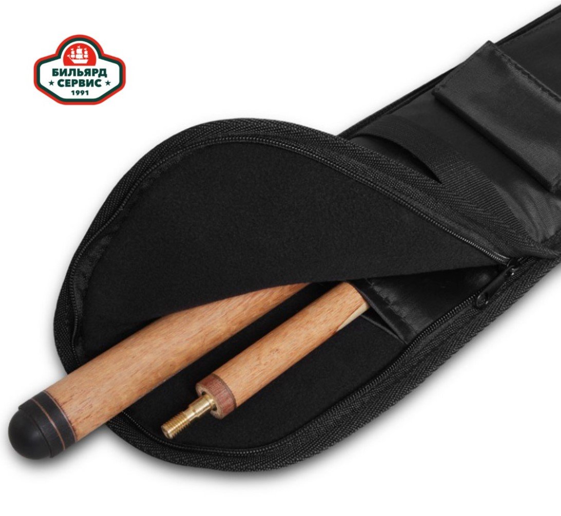 Чехол предназначен для одного кия. Отделка - высококачественный синтетический материал. Торцевая застежка (молния) , ручка для переноски, накладной карман.