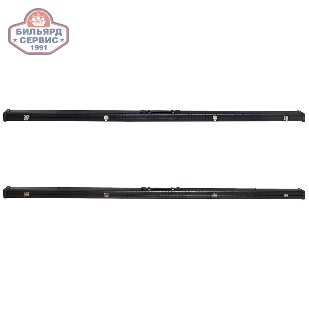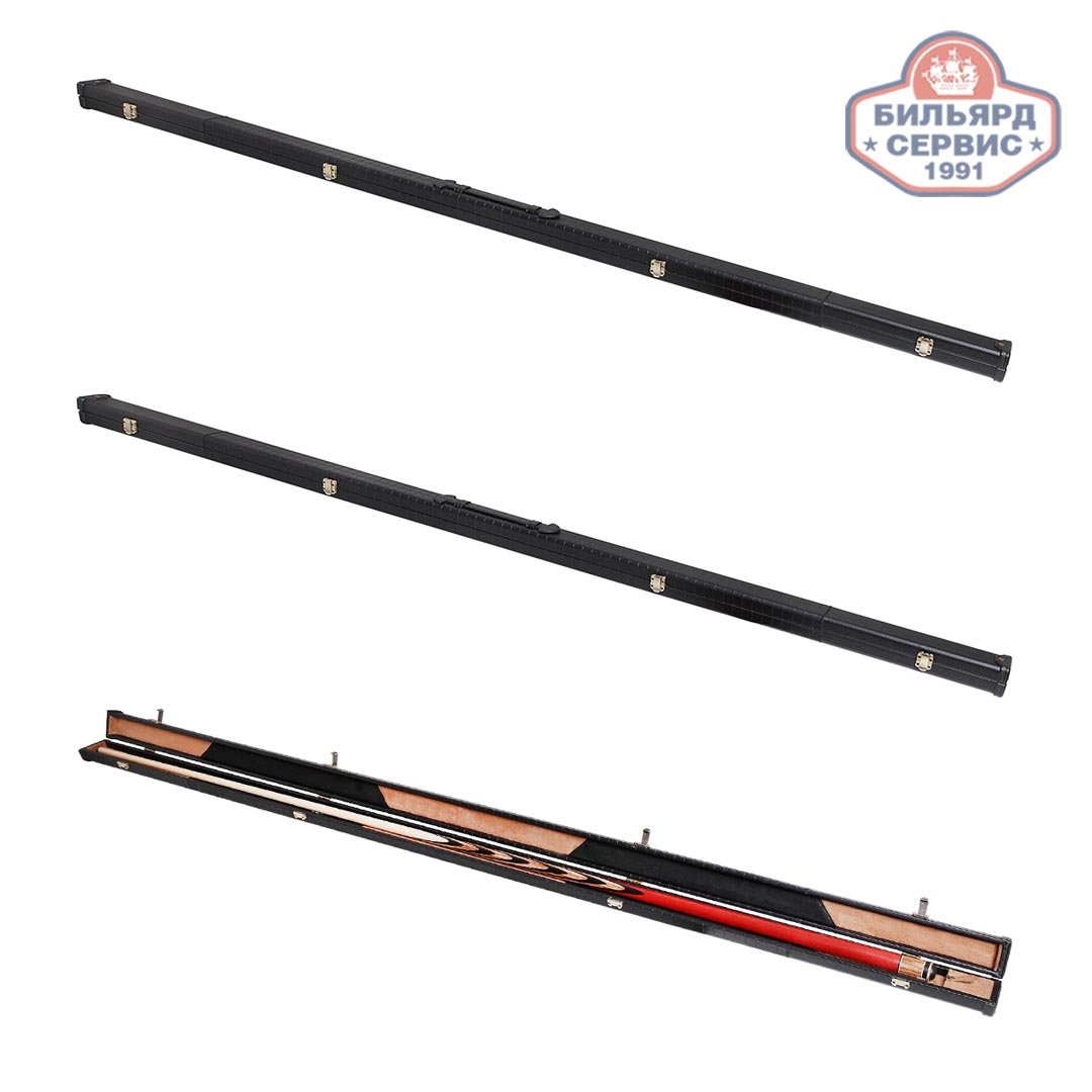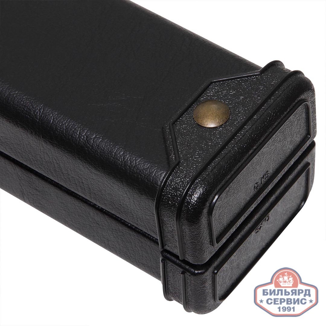 Кейс изготовлен из МДФ, современного прочного и износостойкого материала, наружные поверхности которого обтянуты черным винилом, защищающим от грязи, дождя и снега. Внутренняя поверхность кейса покрыта мягкой тканью темных и светлых тонов, которая выполняет для кия амортизирующие функции при транспортировке кейса