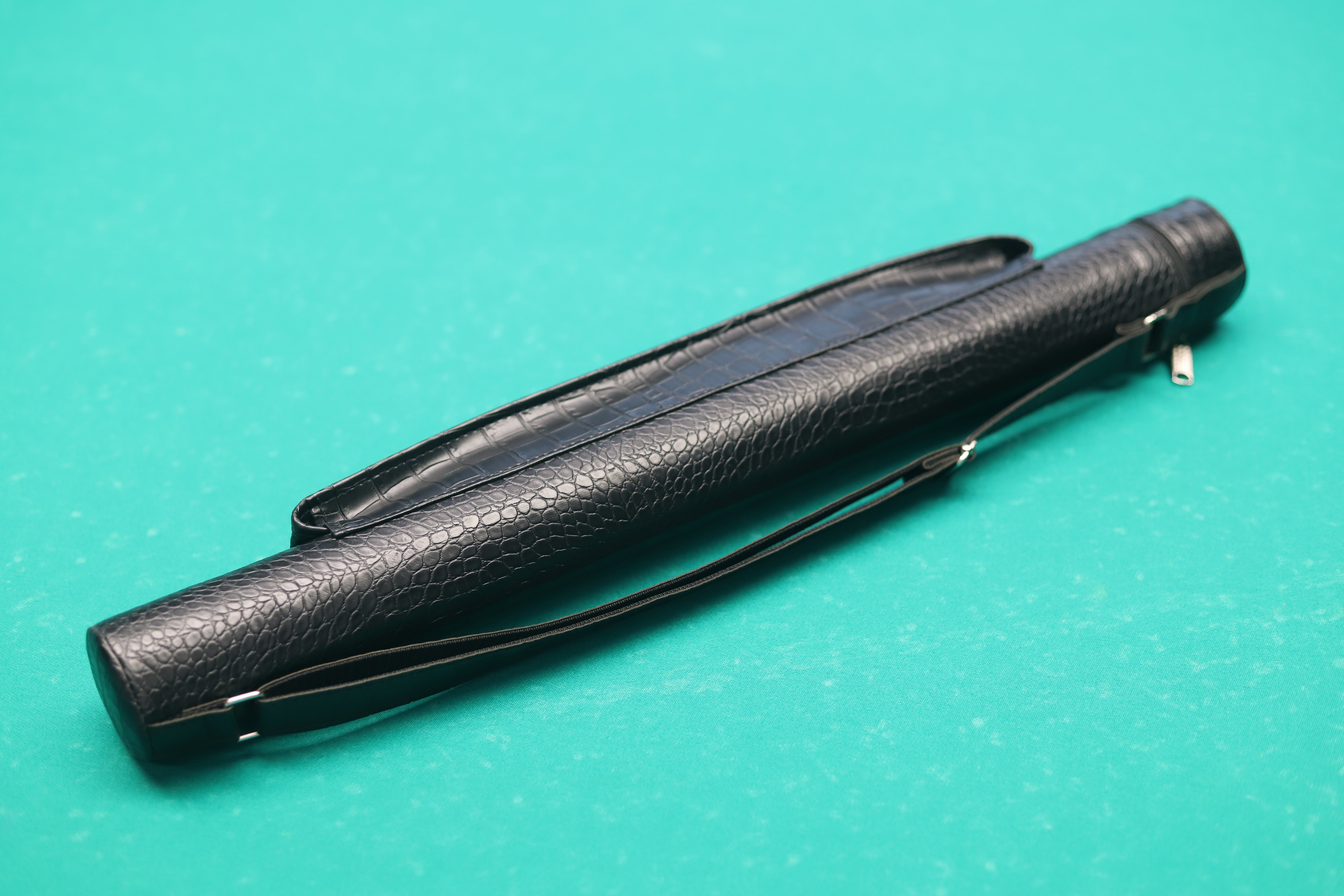 Компактный стильный тубус для 3-х составного кия, выполненный мастером Александром Мосиным. Материал - качественный кож.зам. Есть вместительный карман и наплечный ремень.