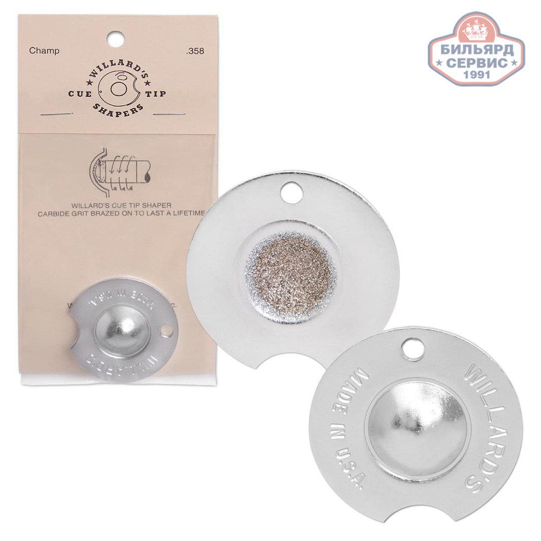 Инструмент для обработки наклейки Willard`s Cue Tip Shapers, выпускается в двух вариантах: окружность с радиусом 10.5 мм Nickel Radius 415 или 8.5 мм Dime Radius 358. Диаметр выдерживается автоматически, специальных навыков правки наклеек не требуется.