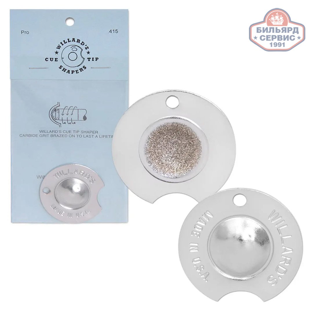 Инструмент для обработки наклейки Willard`s Cue Tip Shapers, выпускается в двух вариантах: окружность с радиусом 10.5 мм Nickel Radius 415 или 8.5 мм Dime Radius 358. Диаметр выдерживается автоматически, специальных навыков правки наклеек не требуется.