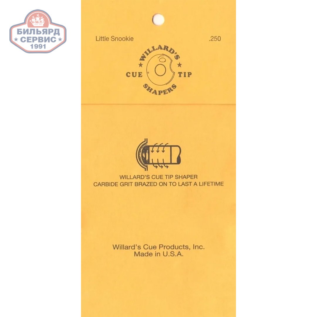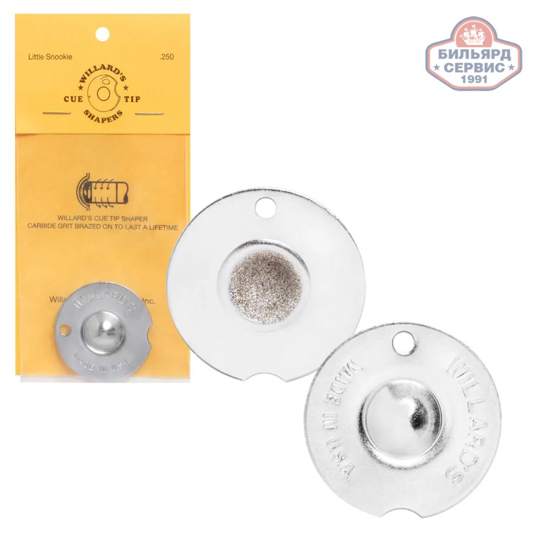 Инструмент для обработки наклейки Willard`s Cue Tip Shapers, выпускается в различных вариантах: под закругление 10.5 мм Nickel Radius 415, 8.5 мм Dime Radius 358 или 6 мм Snooker Radius 250. Диаметр выдерживается автоматически, специальных навыков правки наклеек не требуется.