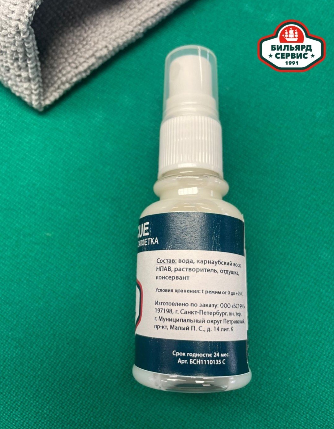 В набор входит флакон с распылителем средства для чистки и полировки кия объёмом 40 мл и салфетка из микрофибры.