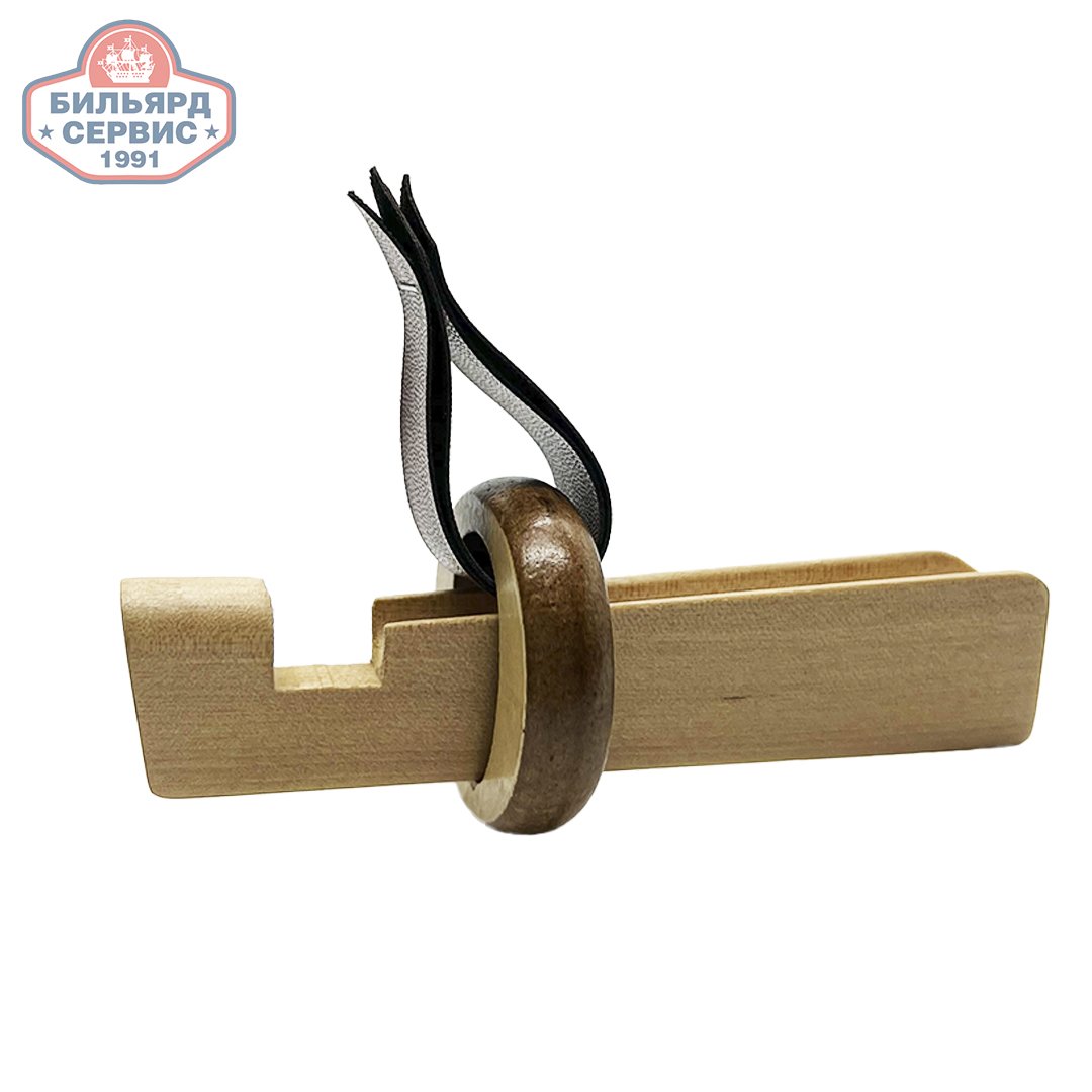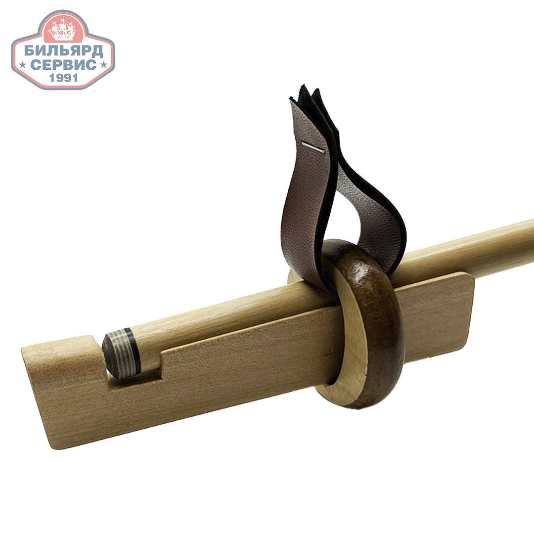 Инструмент, который значительно облегчает работу по смене наклейки на бильярдном кие, надежно фиксируя ее на время, пока засыхает клей. Вероятно, каждый игрок, самостоятельно менявший наклейку, сталкивался с тем, что, пока клей не схватился, наклейка может сместиться. Между тем, наклейку необходимо не просто приклеить, а максимально плотно прижать к стакану, чтобы в пространство между склеиваемыми поверхностями не попали микроскопические пузырьки воздуха, которые снизят прочность соединения.