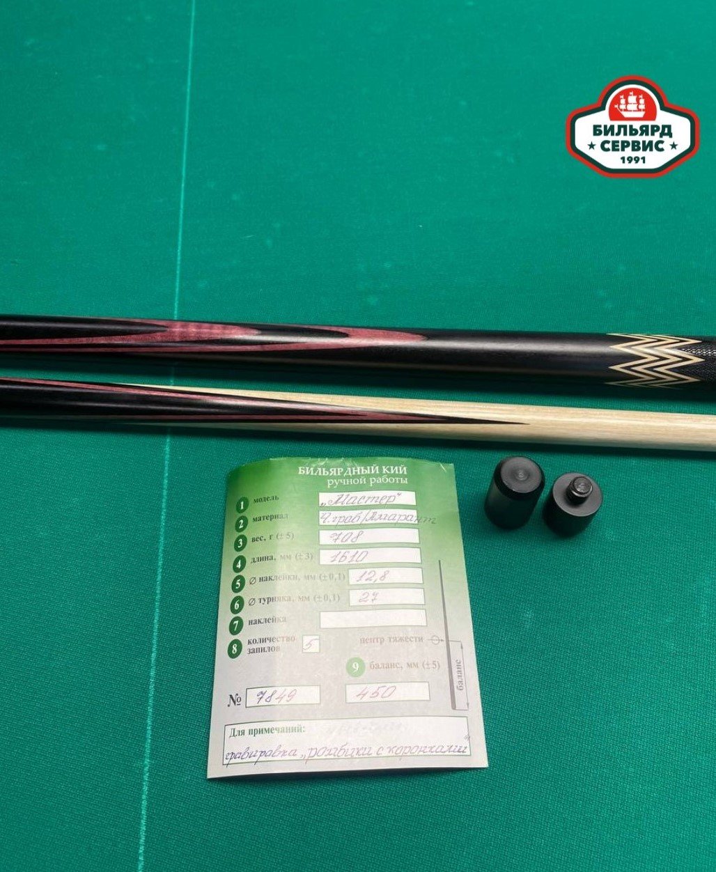 Отличный плотный кий белорусского мастера Сергея Каюкова (чёрный граб/амарант). К каждому кию идёт гарантийный паспорт с точными характеристиками и защитные колпачки для скрутки.