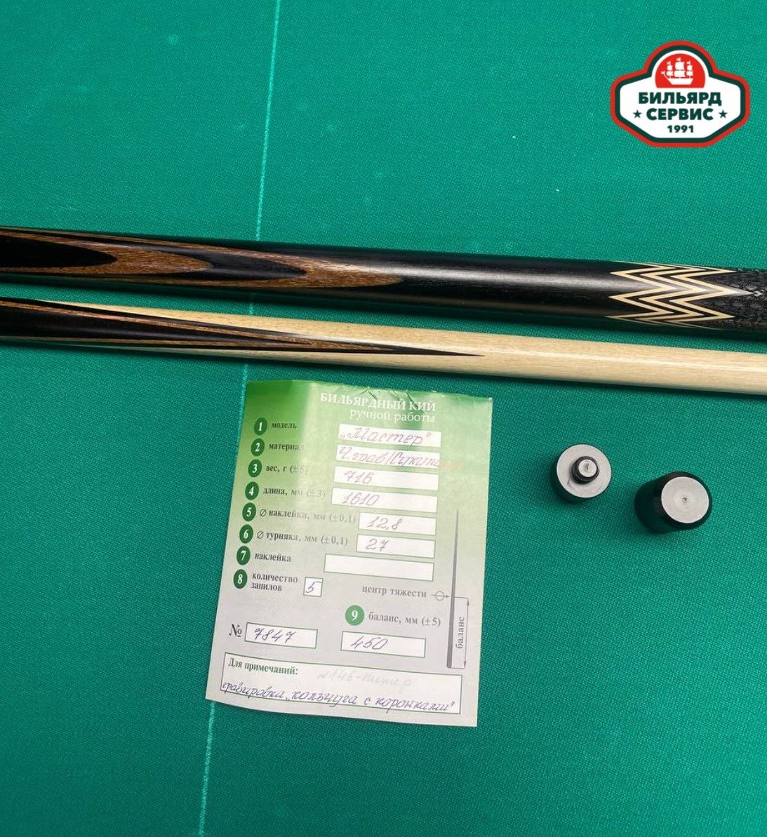 Отличный плотный кий белорусского мастера Сергея Каюкова (чёрный граб/сукупира). К каждому кию идёт гарантийный паспорт с точными характеристиками и защитные колпачки для скрутки.
