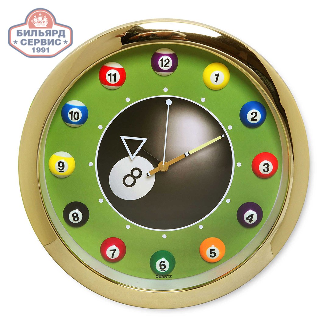 Покупатель может выбрать модели с черным или золотистым ободком, с более светлым или более темным циферблатом. Оформление циферблата посвящено бильярдной тематике. Стрелки хорошо просматриваются на контрастном фоне даже с большого расстояния, поэтому часы подходят для установки в помещениях различного размера.