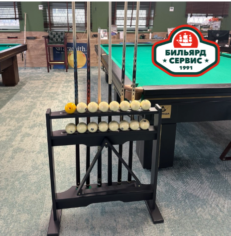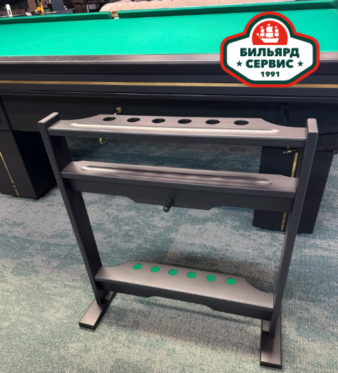 Киевница напольная предназначена для хранения 6 киев в вертикальном положении. Имеются две горизонтальные полочки для хранения бильярдных шаров и крючок для подвешивания треугольника. На полочках предусмотрены ниши для того, чтобы шары не скатывались на пол.