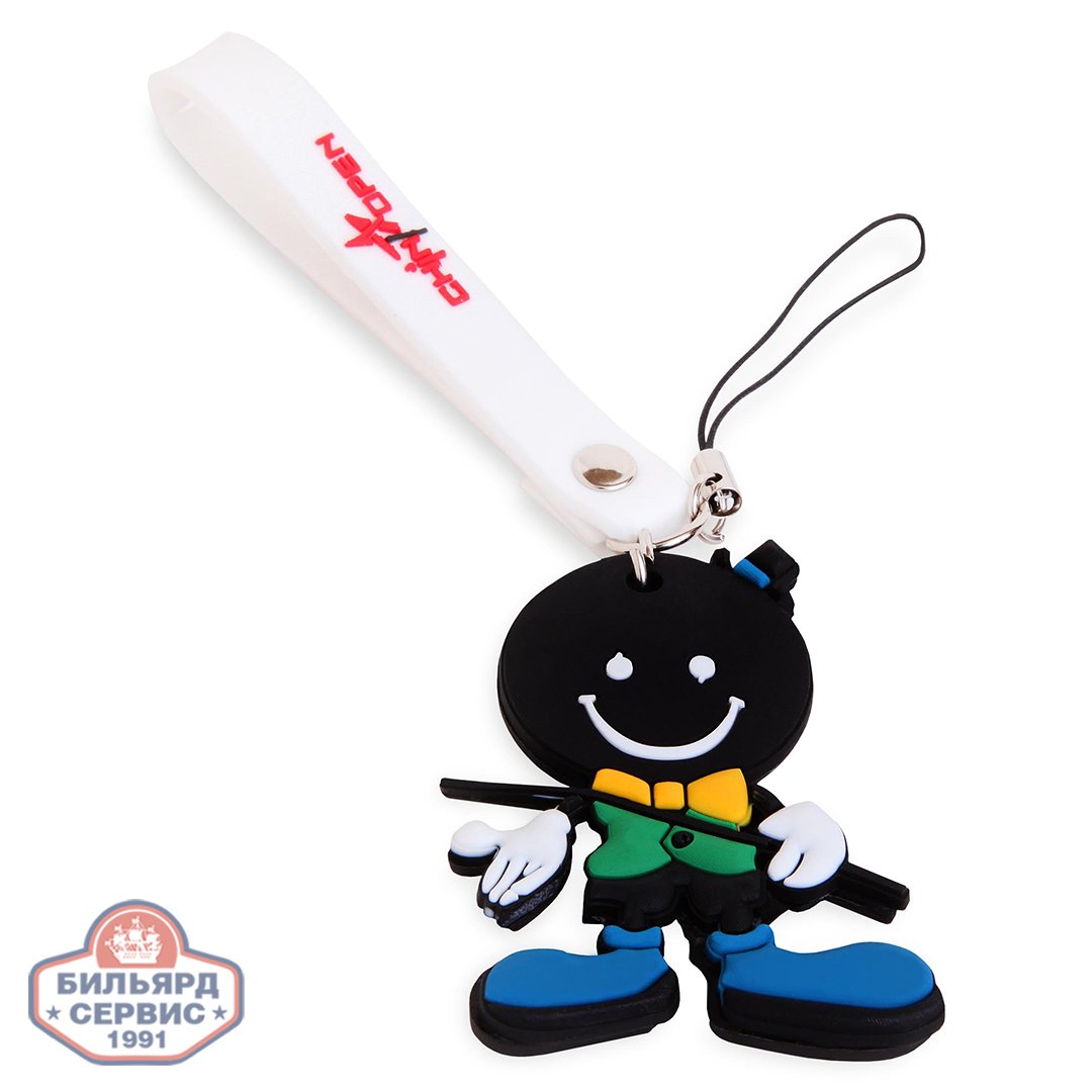 Брелок выполнен в виде плоской фигурки черного бильярдного шара, превращенного художником в забавного улыбающегося человечка с кием. Фигурка изготовлена из резины, закреплена на металлическом кольце. Все соединения для деталей этого аксессуара изготовлены из прочного металла, что позволяет надежно закрепить мобильный телефон, освободив руки игрока.