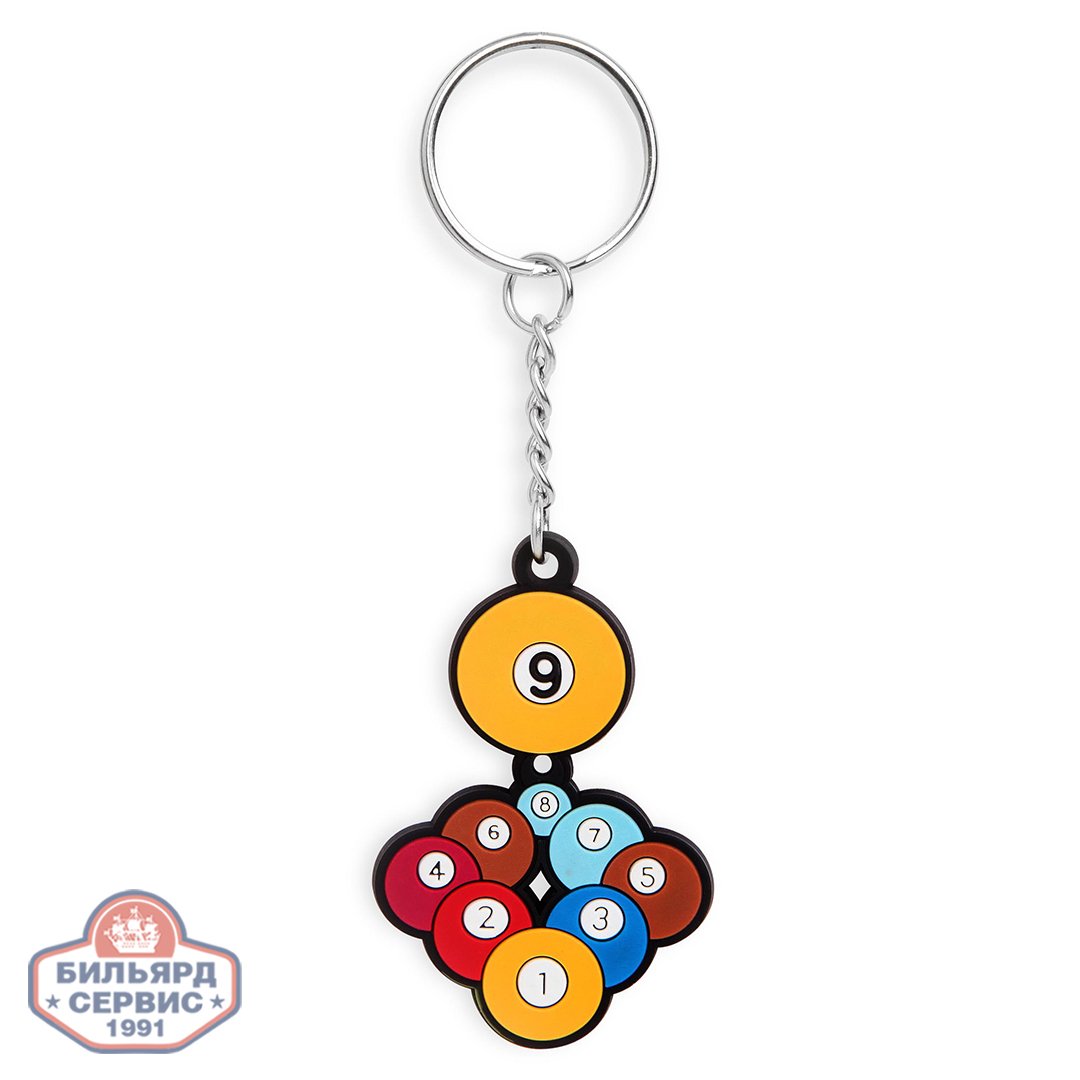 Стильный брелок BK1019 выполнен в виде выстроенных в ромб бильярдных шаров с большим желтым шаром №9 на вершине. Изготовлен из износостойкой и легкой резины в форме плоской фигурки и оснащен металлическим кольцом с цепочкой.
