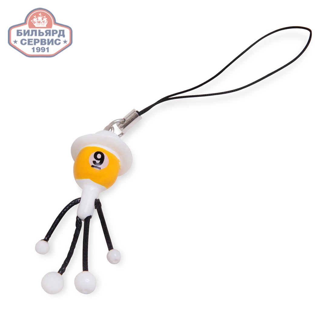 Забавный брелок для мобильного телефона в виде стилизованного человечка в шляпе с бильярдным шаром №9 вместо головы. Брелок изготовлен из пластика, имеет специальный прочный шнурок для крепления к мобильному телефону.