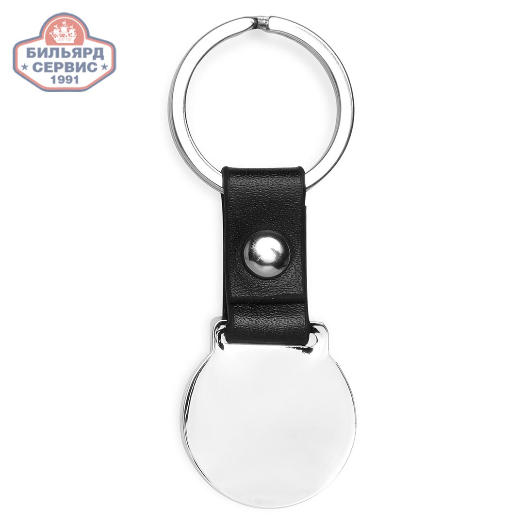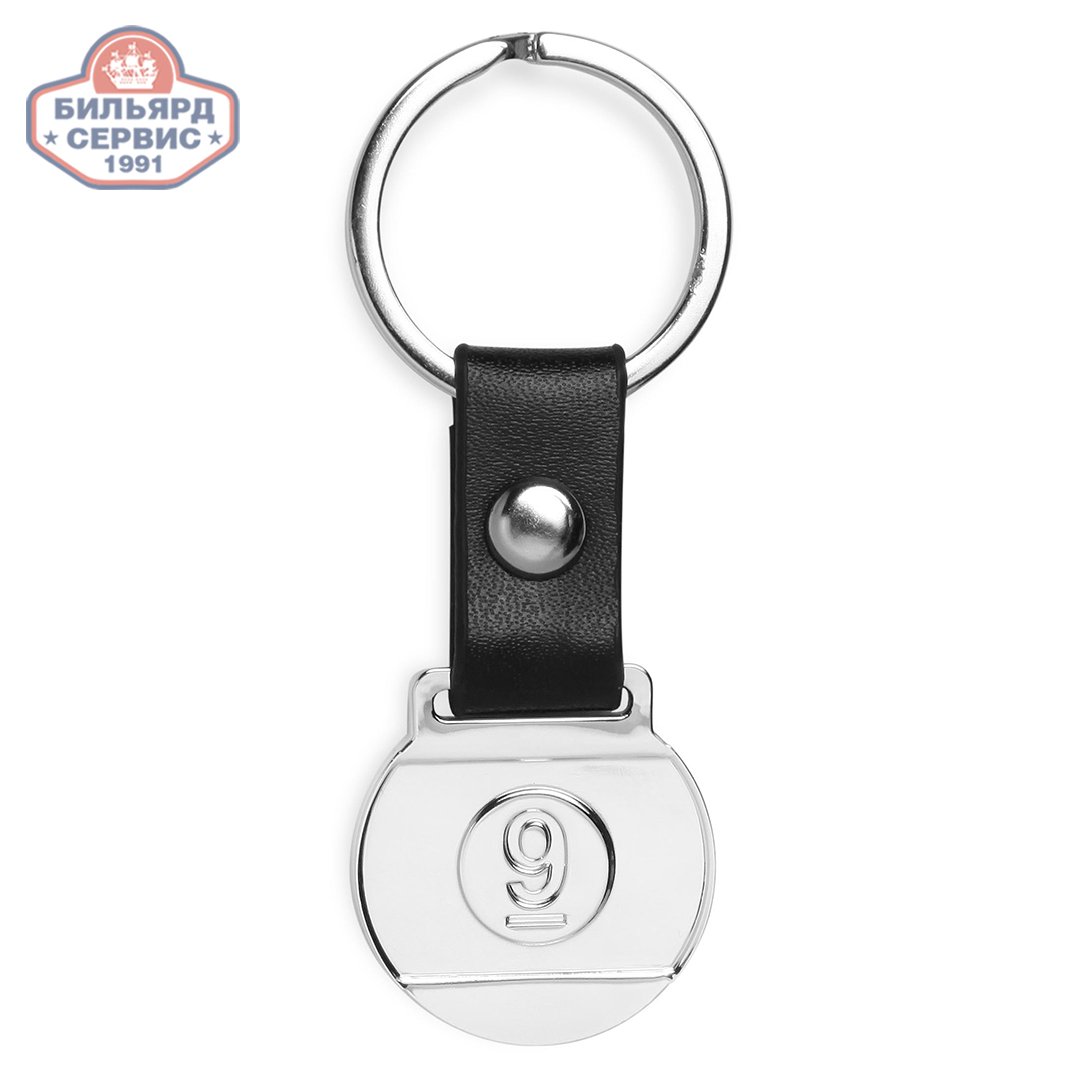 Стильный металлический брелок для ключей выполнен в виде бильярдного шара №9. Диск стального цвета с рельефным изображением 9-ки соединен с металлическим кольцом кожаным ремешком с прочной заклепкой.