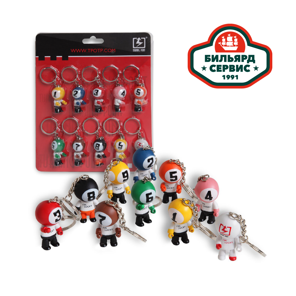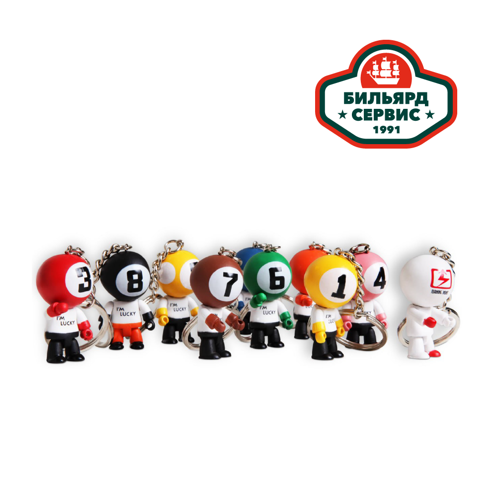 Стильных и красочный брелок, изготовленный в виде маленького человечка-бильярдиста. У кукол подвижны части корпуса, каждая кукла оснащена металлическими цепочкой и кольцом для соединения с ключами, подвешивания к чехлам, сумкам, рюкзакам и другим предметам.