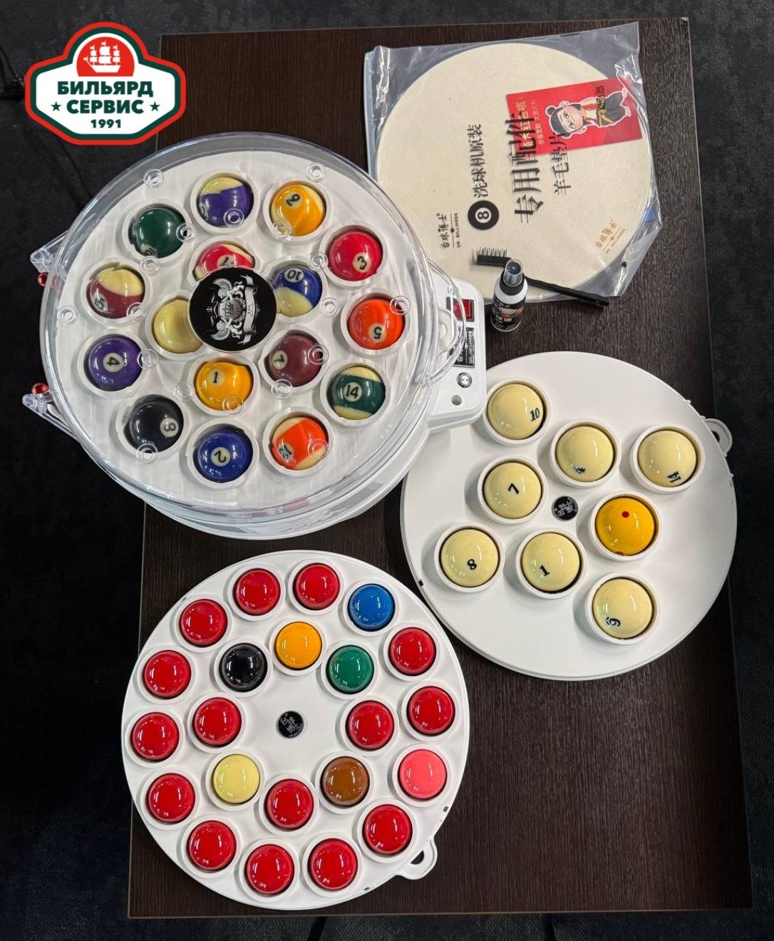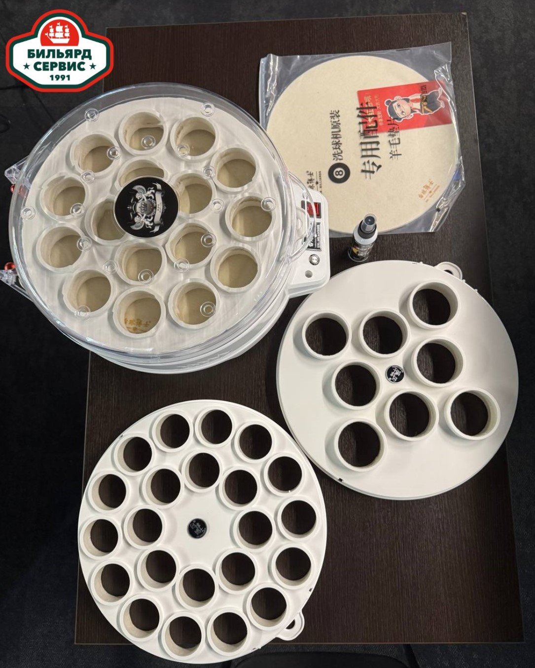 В комплекте машинка для чистки шаров, сменные разделители для шаров для пирамиды, пула и снукера, флакон средства для чистки шаров 100 мл, сменный фетровый диск, щетка для чистки валиков, переходник вилки.