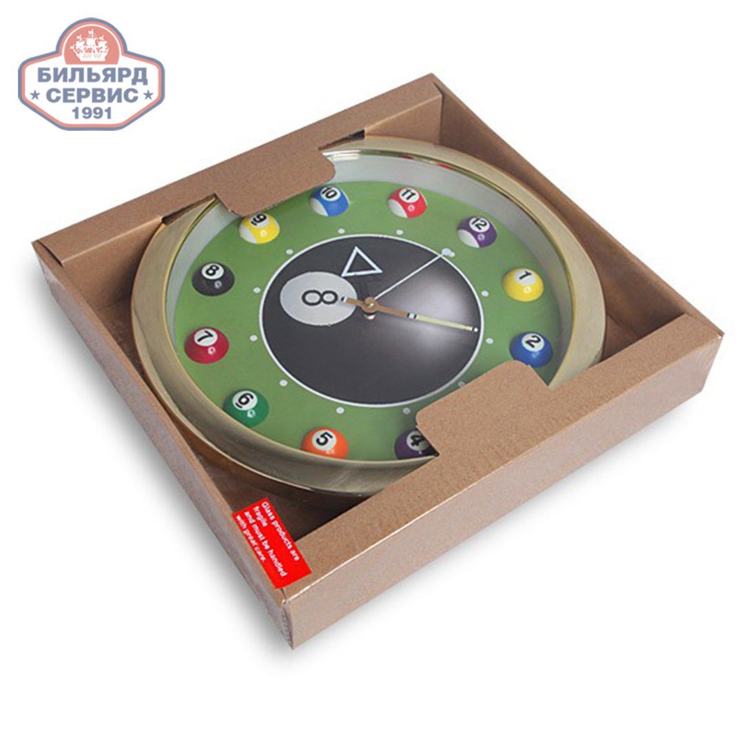 Покупатель может выбрать модели с черным или золотистым ободком, с более светлым или более темным циферблатом. Оформление циферблата посвящено бильярдной тематике. Стрелки хорошо просматриваются на контрастном фоне даже с большого расстояния, поэтому часы подходят для установки в помещениях различного размера.