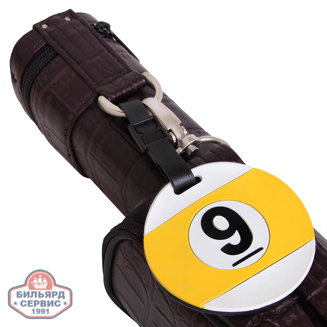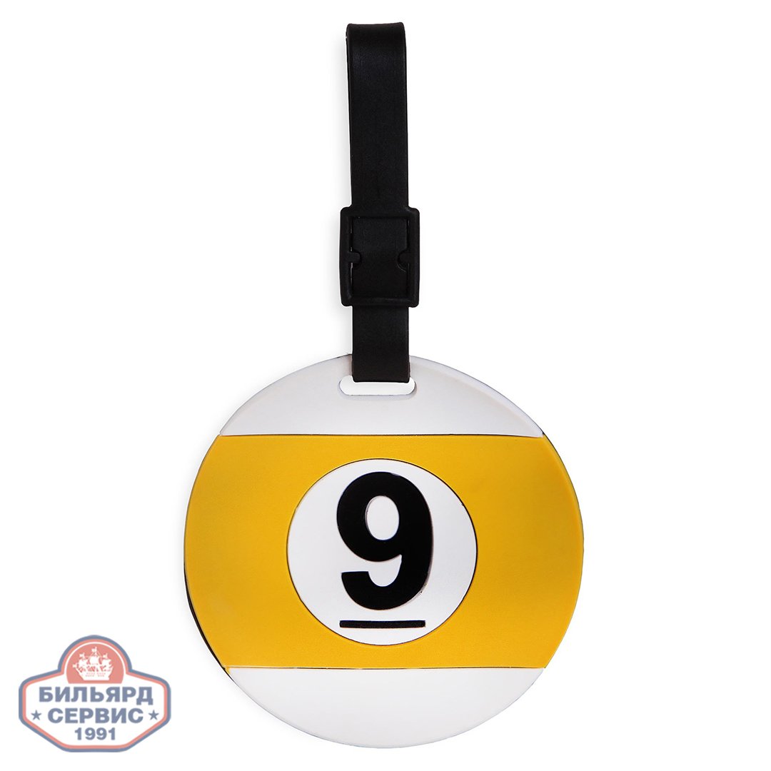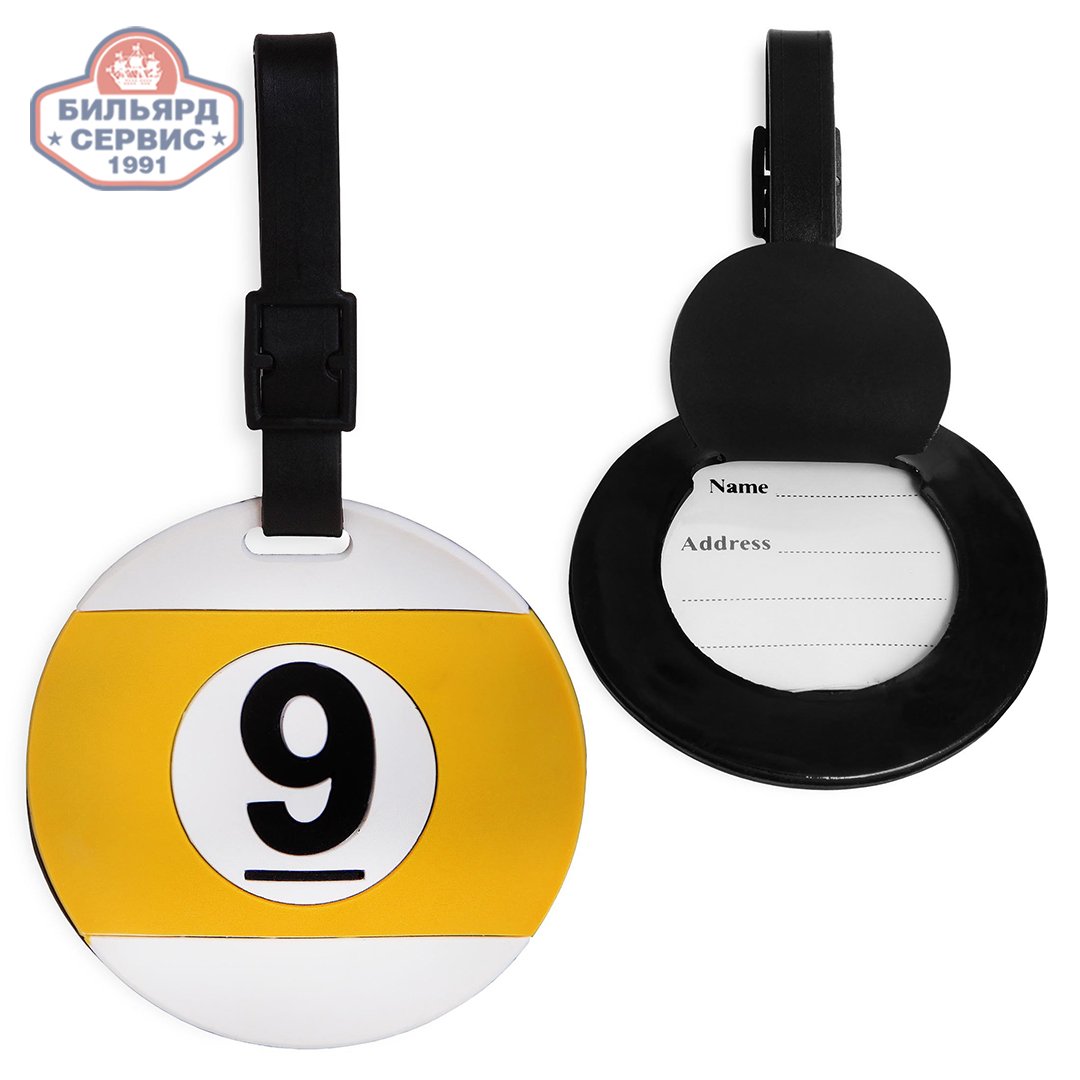 Именная резиновая бирка, оформленная в виде бильярдного шара №9. Поле для указания личных контактов (имя, адрес) скрыто под однотонным черным слоем с обратной стороны бирки.