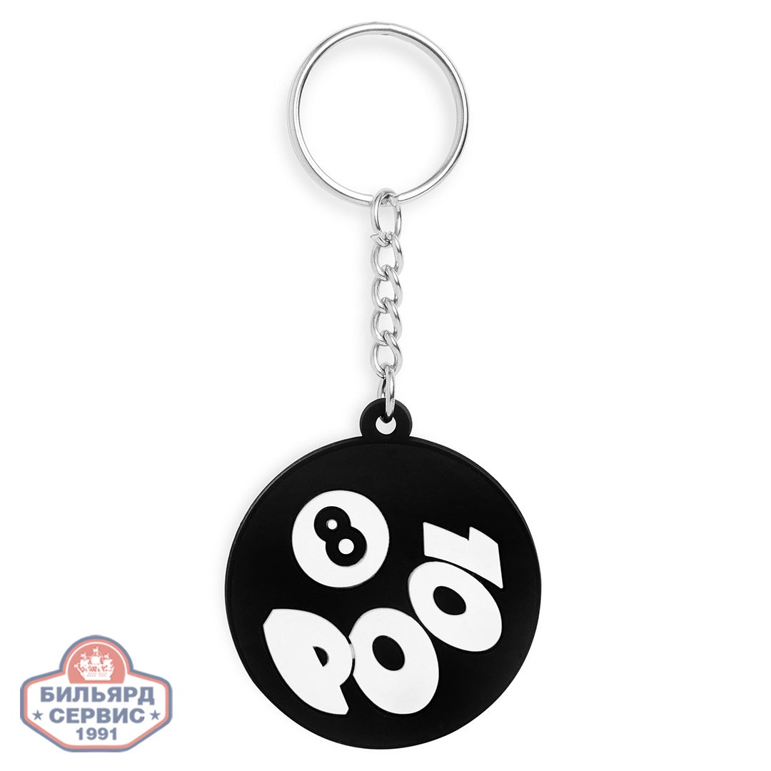 Плоский резиновый брелок для ключей, оснащенный металлическим кольцом и цепочкой. Брелок стилизован под бильярдный шар черного цвета с номером «8» и надписью «POOL».