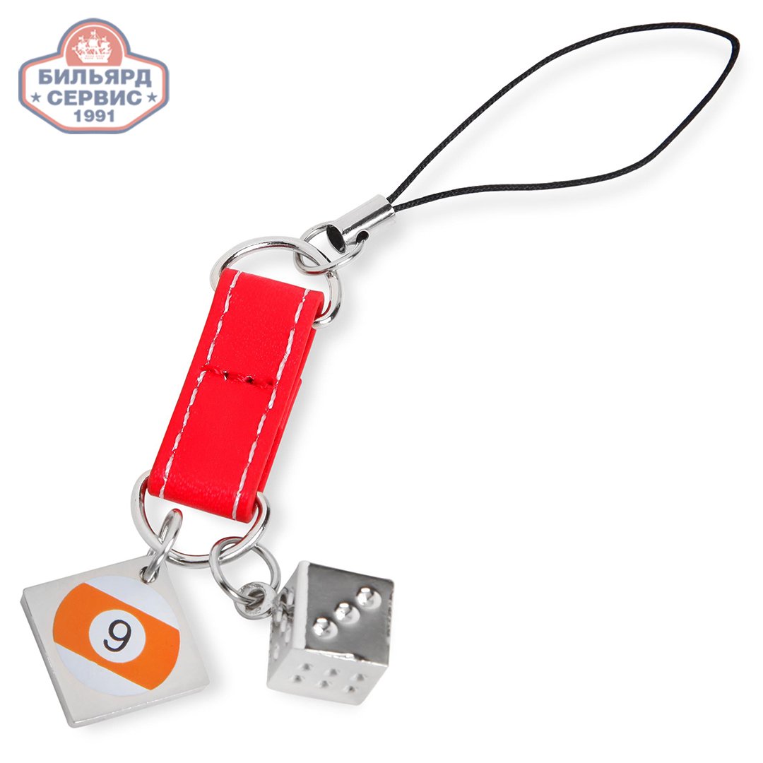 Необычный брелок для мобильного телефона, который понравится любому азартному человеку. Фигурки брелока - это миниатюрные изображения бильярдного шара №9 и игральной кости, выполненные из металла.
